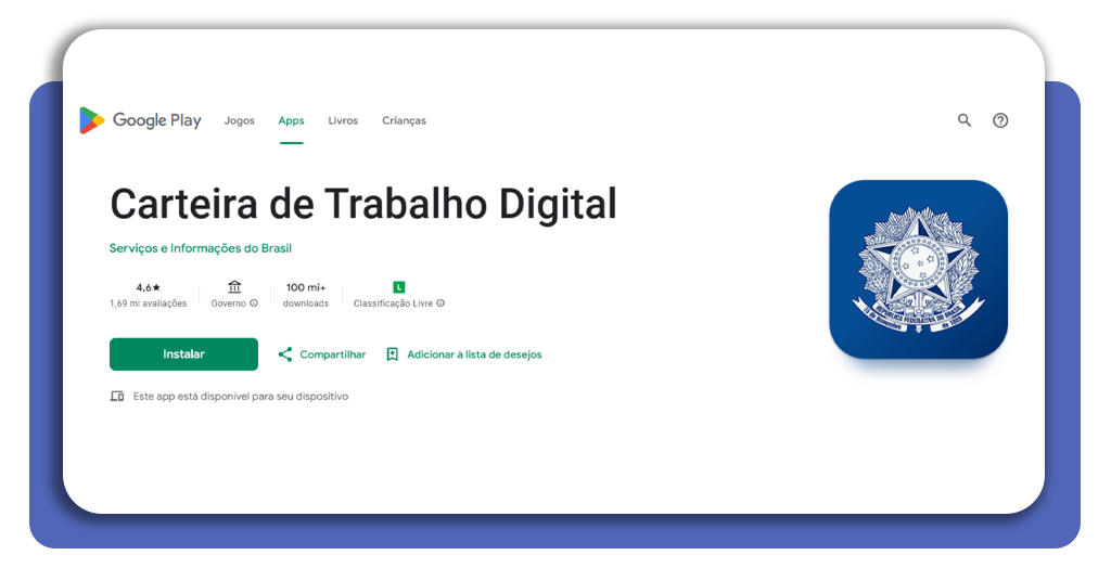 Acesse sua loja de aplicativos, busque pelo “Carteira de Trabalho Digital”, disponível para Android e iOS, e faça o download como de costume.