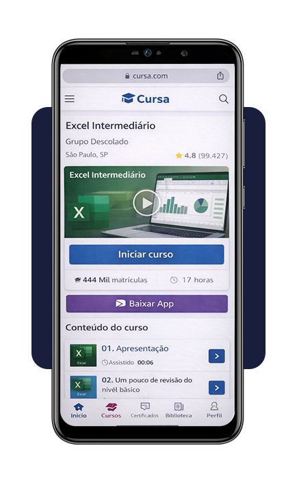 Uma das opções disponíveis é o curso oferecido pela plataforma Cursa, liberado para Android e iOS e que disponibiliza conteúdo online e gratuito para quem deseja aprender Excel de forma prática e acessível.