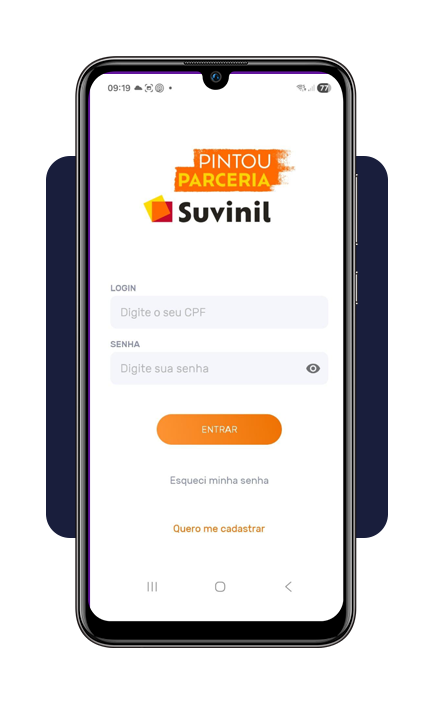 Abra o Pintou Parceria Suvinil (Android | iOS) e vá em “Quero me cadastrar”. Preencha todos os campos obrigatórios e confirme sua inscrição.