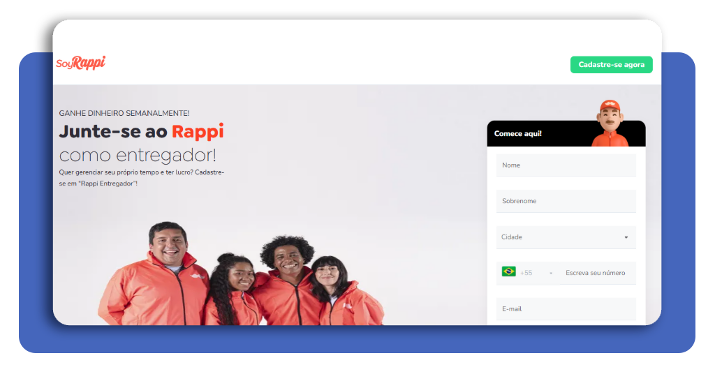 Acesse a página de cadastro da Rappi e clique em “Quero ser entregador”.
