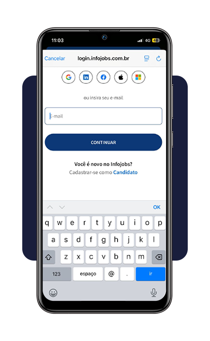 Caso precise que o processo seja mais rápido, faça o login utilizando o LinkedIn, Gmail, Apple, Facebook ou Microsoft.