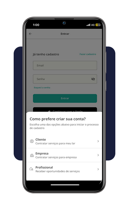 Na tela inicial, você precisa criar seu cadastro. Para isso, toque em “Fazer Cadastro” e, em seguida, em “Profissional – receber oportunidades de serviço”.